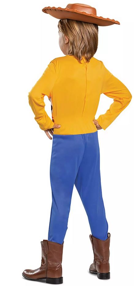 Included is a printed jumpsuit featuring blue bottoms, patterned shirt, waistcoat and sheriff badge and Woody's signature cowboy hat.