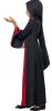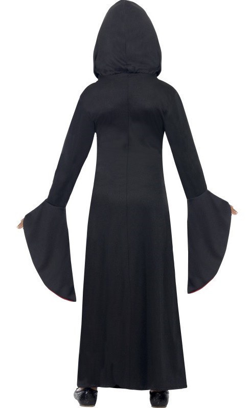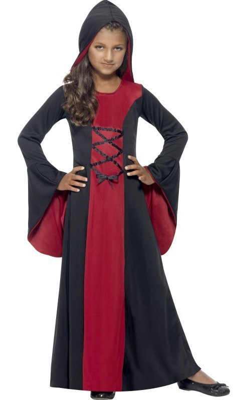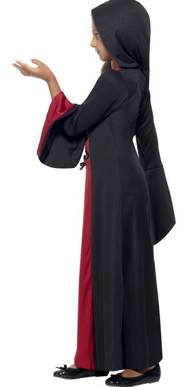 The Kids Vamp costume includes a long black and red dress with lace up front detail and a hood.