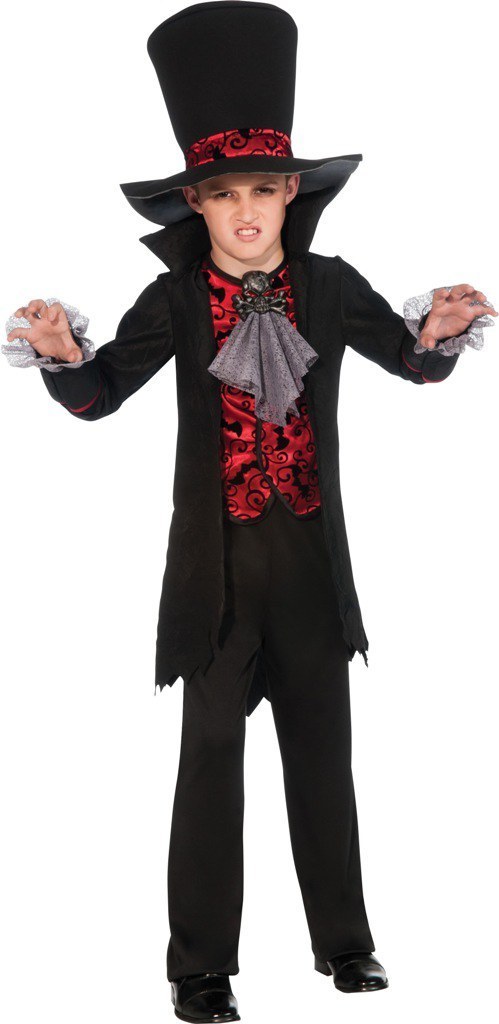 This Kids Vampire Lord costume includes a long black jacket with attached red and black waistcoat and a jabot with skull. Also included is a pair of black trousers.