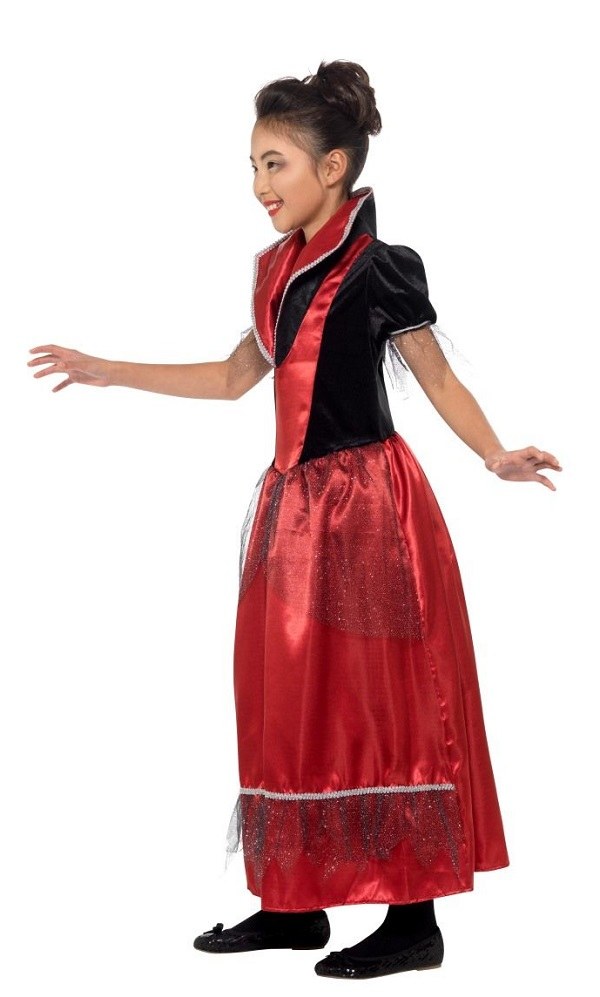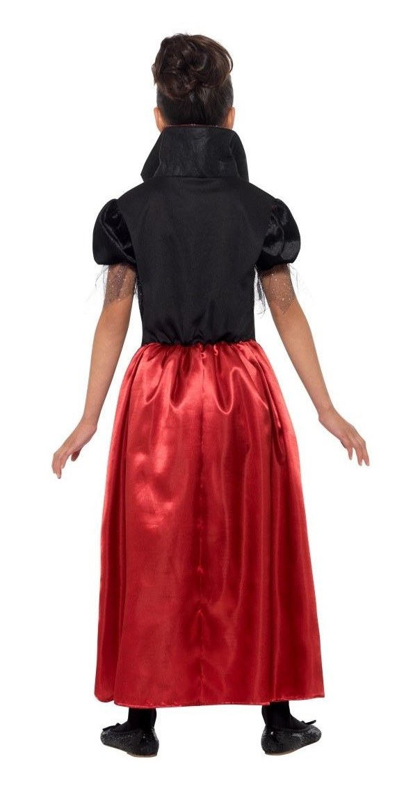 Kids Vampire Princess Costume includes a long black and red dress with an attached stand up collar.