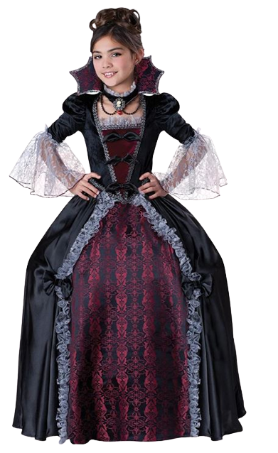 The Vampiress of Versailles costume includes a full length ball gown finished with gold accents and a full structured petticoat.