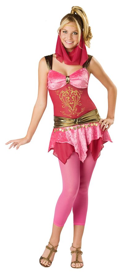 The Veiled Vixen costume includes a pink, gold and dark red dress. The top of the dress is a pink velvet with gold and black straps. There are prints on the front of the dress and golden coins hang on beads from the waist.