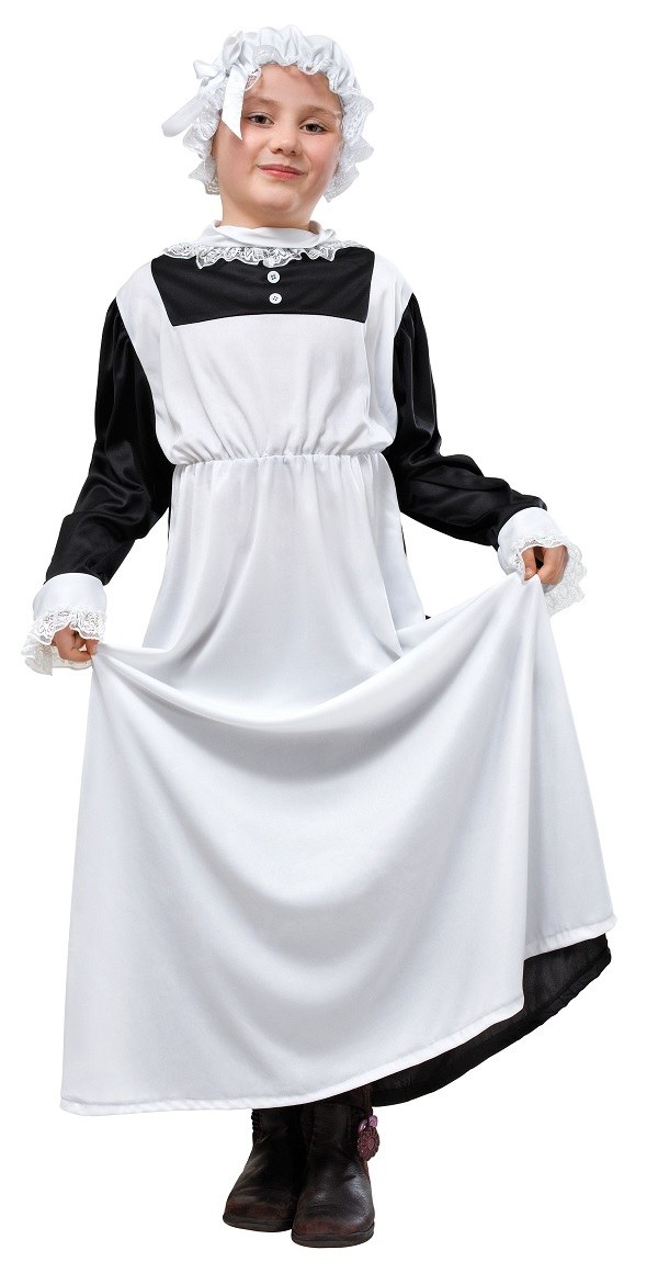 Kids Victorian Maid Costume includes a dress with an attached white apron and button detailing. To complete the look a white hat with lace and bow detailing is also included.