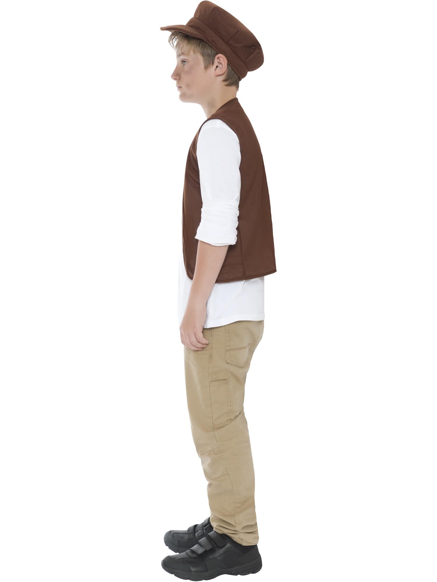 This brown ensemble includes a traditional waistcoat and matching cap, capturing the authentic look of a street-smart Victorian youngster.