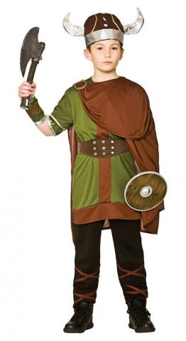 This Kids Viking Warrior costume includes a green and brown top with brown cape and a belt. Costume also includes a pair of trousers and arm cuffs.