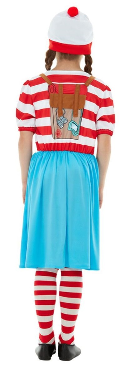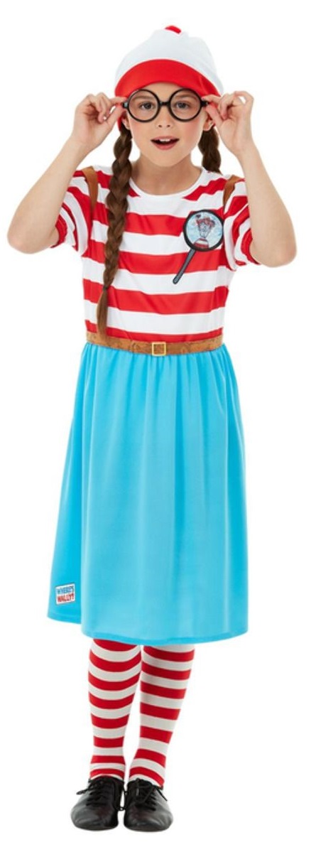 This adorable Where's Wally? Deluxe Wenda Kids Costume includes a red and white striped dress with 3D print and design on the back and an attached blue skirt. The costume also includes a matching hat and a pair of red and white striped tights. To complete the look a pair of black circular framed glasses are also included. Perfect for World Book Day! Keep them guessing where you are in this kids costume!