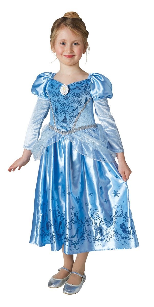 This officially licensed Kids Winter Cinderella Costume includes a long sleeved dress with faux fur trims and a sparkly glitter detail throughout. The dress also features jewel detail and a picture of Cinderella printed on the front. To complete the look a matching faux fur cape is also included.