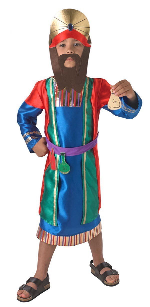 This Kids Wise Man costume includes a colourful tunic with detachable fabric bottles. The costume also includes a crown headdress with attached beard.