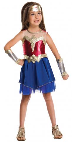 This Dawn Of Justice Kids Wonder Woman costume includes a dress with tutu style skirt. Also included in this superhero costume is a pair of arm cuffs, necklace and a headpiece.