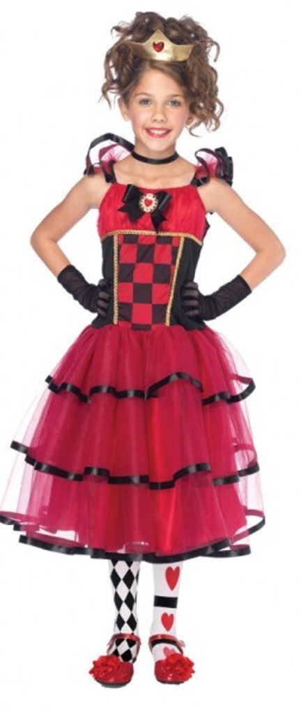 This beautiful Wonderland Queen costume for girls includes a layered black and red dress with black and red checkered detail, gold braiding and cameo bow accent on the bodice. Also included with the costume is a black ribbon choker and gold crown with faux red jewel.