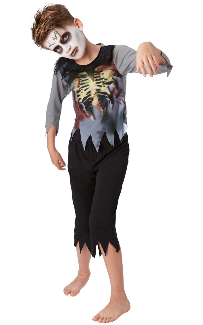 This Halloween, why not rise with the dead and turn into this spooky zombie - give your trick-or-treat victims a closer look at your gory rib cage, poking through your tattered shirt.