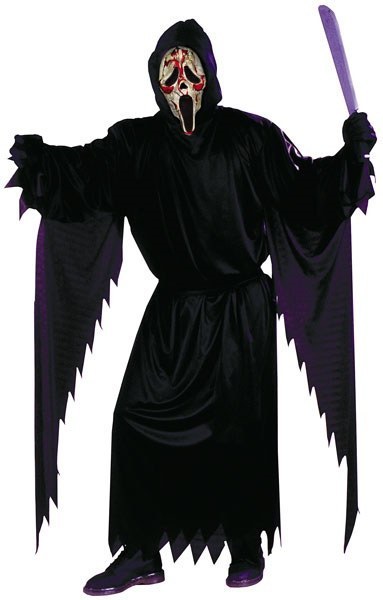 Kids Zombie Ghost Face costume includes a long black hooded robe with drape sleeves and a black belt. To complete the look a ghost face mask is also included.