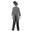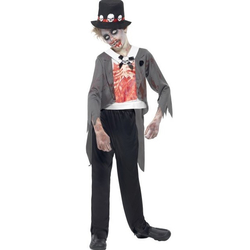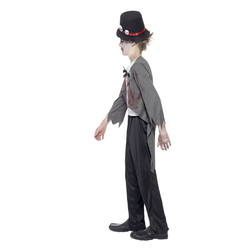 Kids Zombie Groom Costume includes a long grey jacket with attached printed mock shirt and a a pair of trousers. To complete the look a hat is also included.