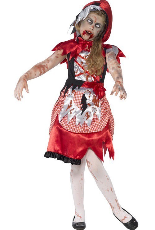 The Kids Zombie Miss Hood costume includes a blood stained printed dress and a red hooded cape. Add some fake blood to complete the pictured look.