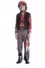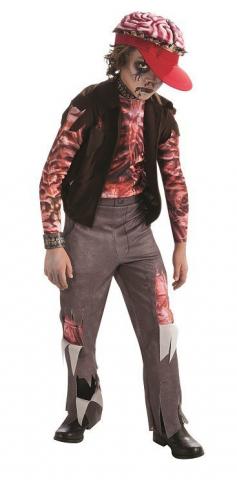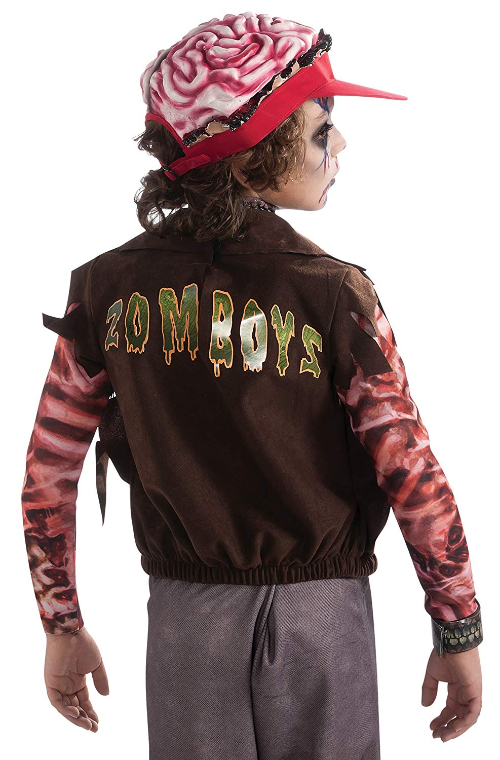 This Kids Zombie Punk Rocker costume includes a brown sleeveless jacket with an attached printed shirt and "zomboys" lettering on the back. Also included in this creepy costume is a pair of grey ripped trousers.