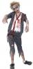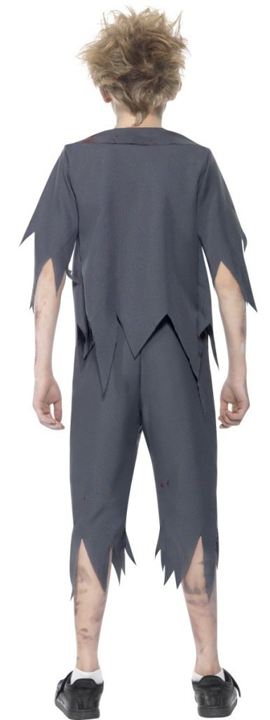This Kids Zombie School Boy costume includes a grey ripped jacket with blood stains and an attached mock shirt and tie. Also included in this gruesome look is a pair of ripped three quarter length trousers.