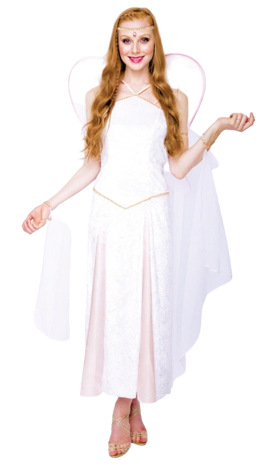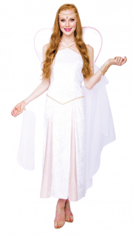 Archangel costume includes a long white lace dress with gold detailing and a cream satin insert in the skirt. Also included in this elegant costume is a pair of angel wings and a headband.