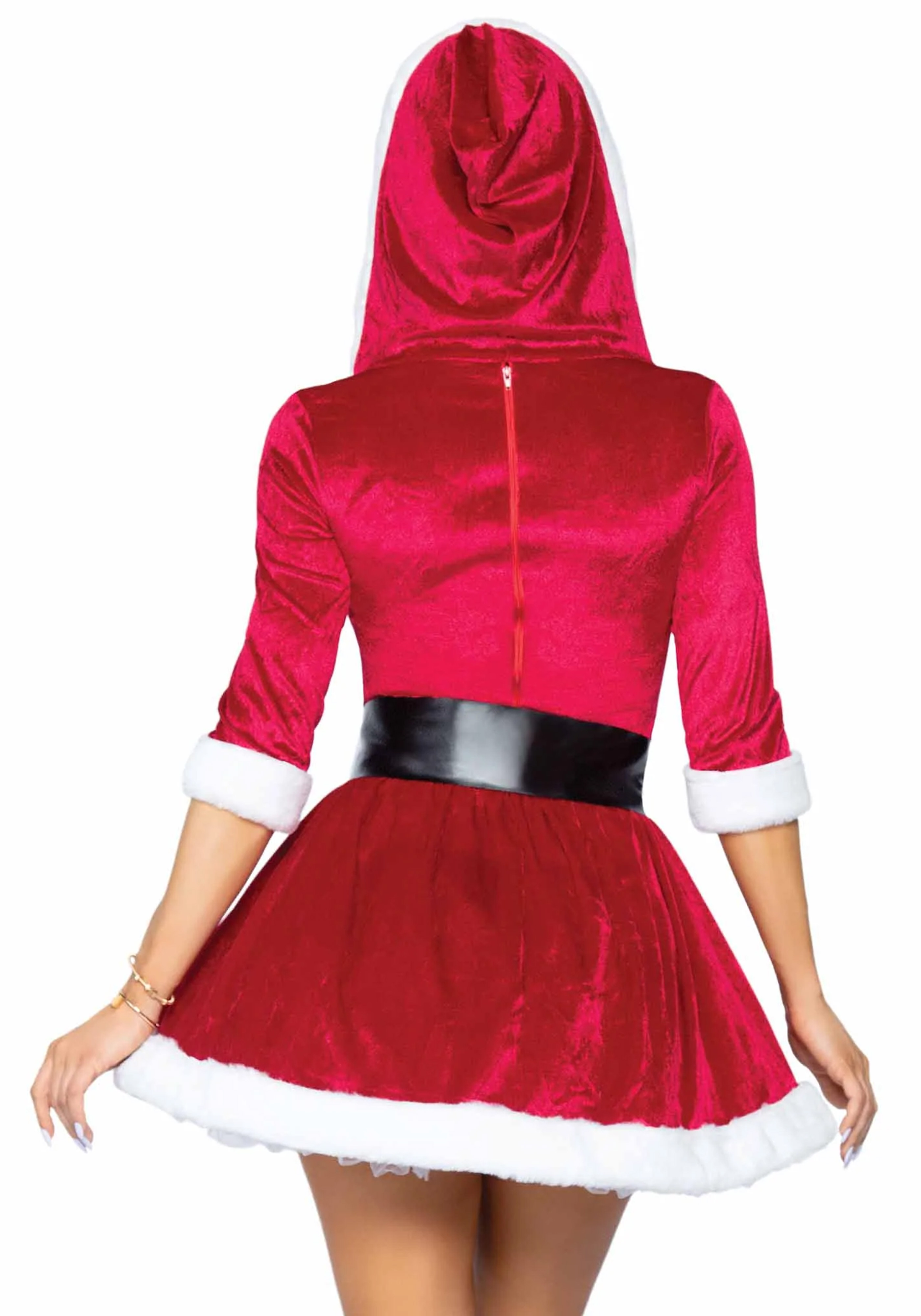 Mrs Claus costume includes a velour hooded dress with faux fur trim and an oversized belt.