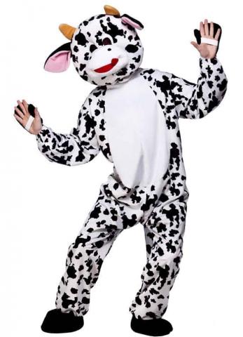 Cute Cow Mascot includes a black and white spotted jumpsuit with white belly and black hand covers. The jumpsuit also features attached black show covers. To complete the look a cow mascot head is also included.