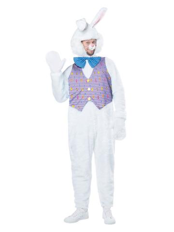 This Costume includes a plush jumpsuit with attached vest, mittens, a plush bunny hood with ears and a bow tie
