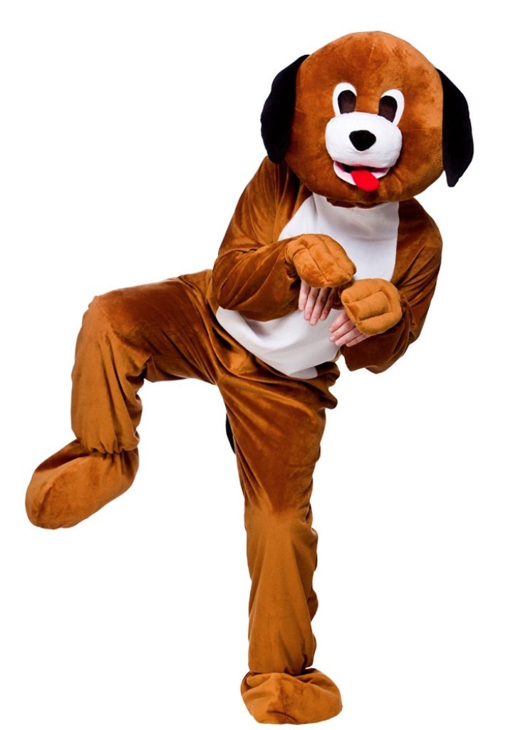 Playful Puppy Mascot includes a brown jumpsuit with white belly and a pair of attached hand covers. Also included is a Mascot head and a pair of shoe covers.