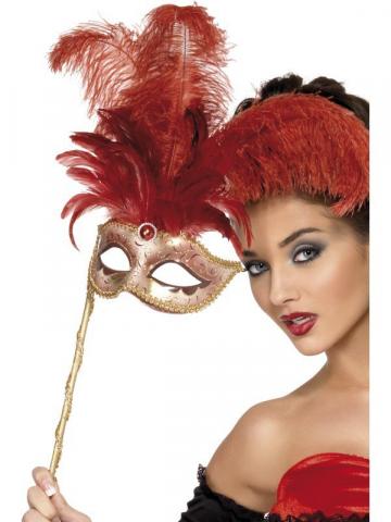 The Baroque Fantasy Mask is an elegant eye mask on a golden stick with beautiful red feathers.