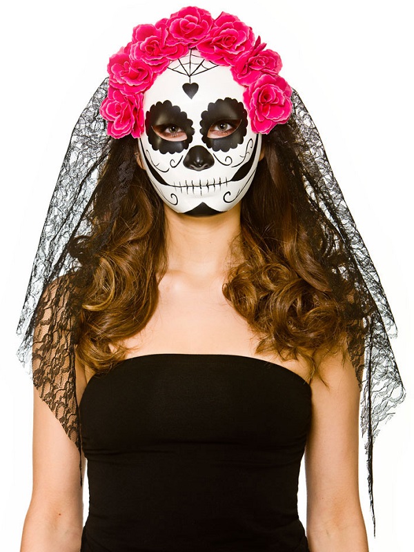 Deluxe Day Of The Dead Mask With pink flowers and a black Veil.