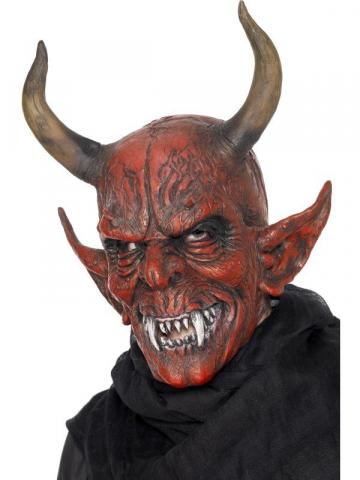 Full head Devil Demon Mask with attached horns. The mask is made of latex and is red in colour with pointed ears and scary demon teeth.