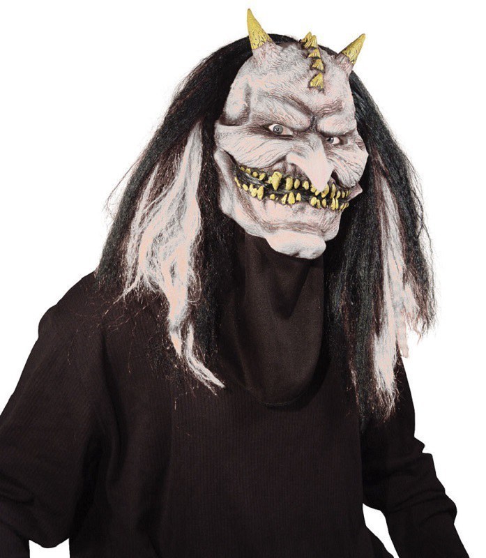This scary El Diablo Moving Mouth Mask is a full overhead mask with black and white hair. The mask is grey with a protruding evil grin, large nose with horns coming from the head. As features in "Love Hate".