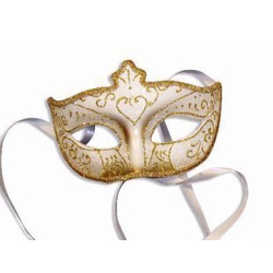 A white eyemask with sparkling gold trim, gold and pale turquoise glitter design.
