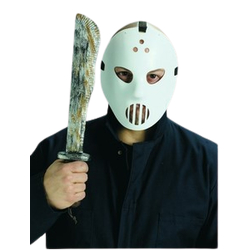 The Hockey Mask And Machete Set includes a white hockey mask and a plastic machete with a rustic finish.