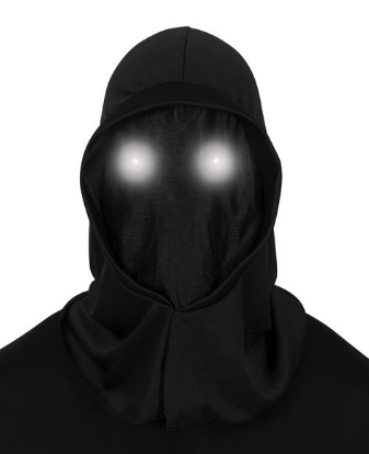 Turn heads—and make them turn away in fear—with our LED Eyes Costume Hood! This eerie black hood features glowing LED lights in the eye sockets, giving you a sinister and supernatural look that’s perfect for any horror-themed event. Whether you're dressing up as a shadowy demon, futuristic assassin, or undead creature, this accessory instantly levels up your costume.Spook all your friends this Halloween with this Hooded Killer Mask! The mask is made of durable plastic with a solid band around the back of the head for added support when wearing. To complete the look, this mask comes with three light modes: continuous, fast blinking, slow blinking. This is the perfect accessory to complete any spooky costume.