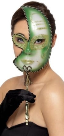 Mardi Gras Green Eye mask on a gold stick with gold and green glitter details