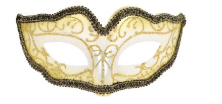 A metallic eyemask with sparkling gold glitter design and ribbon tie.