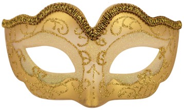 A metallic gold eyemask with sparkling white and gold glitter design and ribbon tie.
