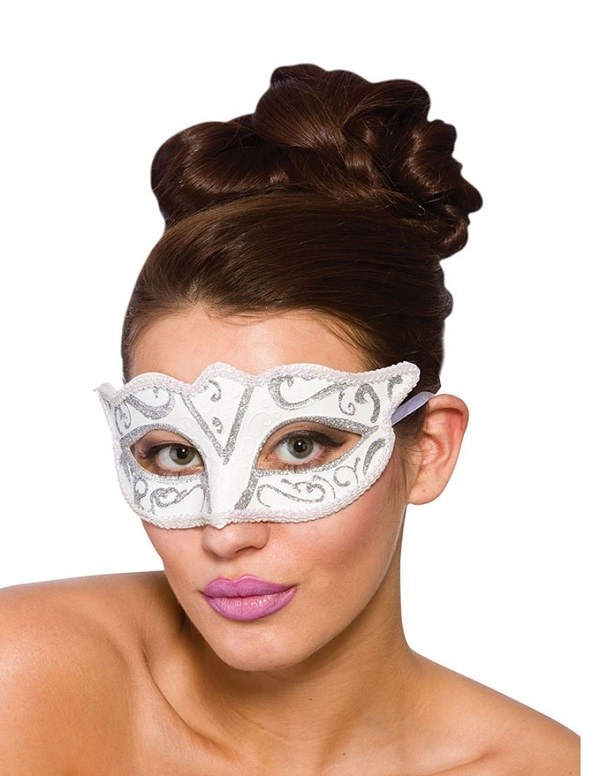 White and silver glitter eyemask with black trim. The mask features a band to hold the mask securely onto your face.