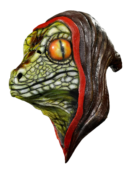From the board game Mice and Mystics comes our Jakobe mask - Green gecko latex mask with a brown latex hood.