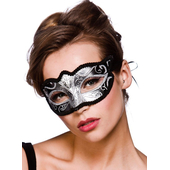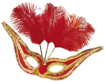 Red Gala Eye Mask with three plumes and gold trimming also available in black, white and pink.