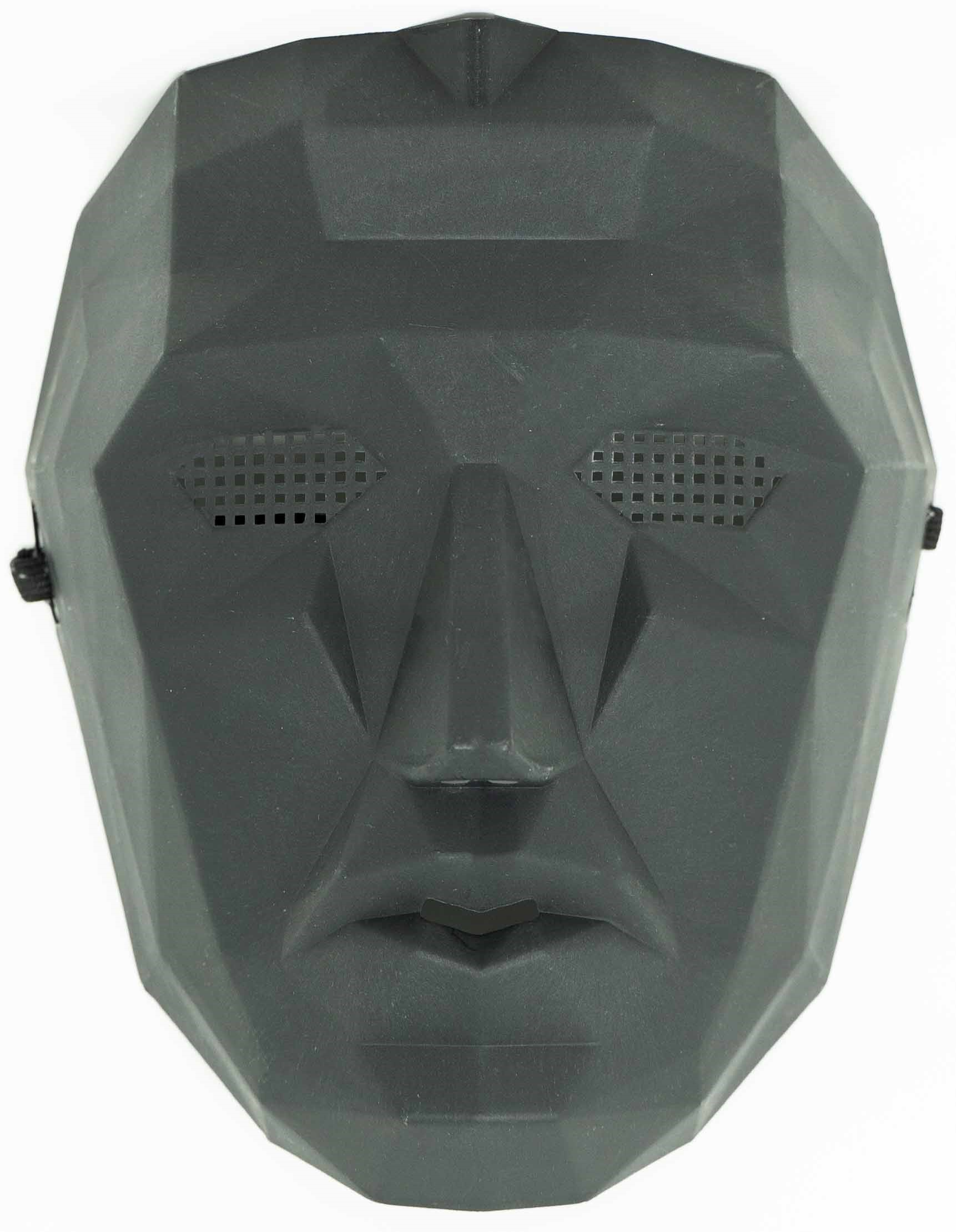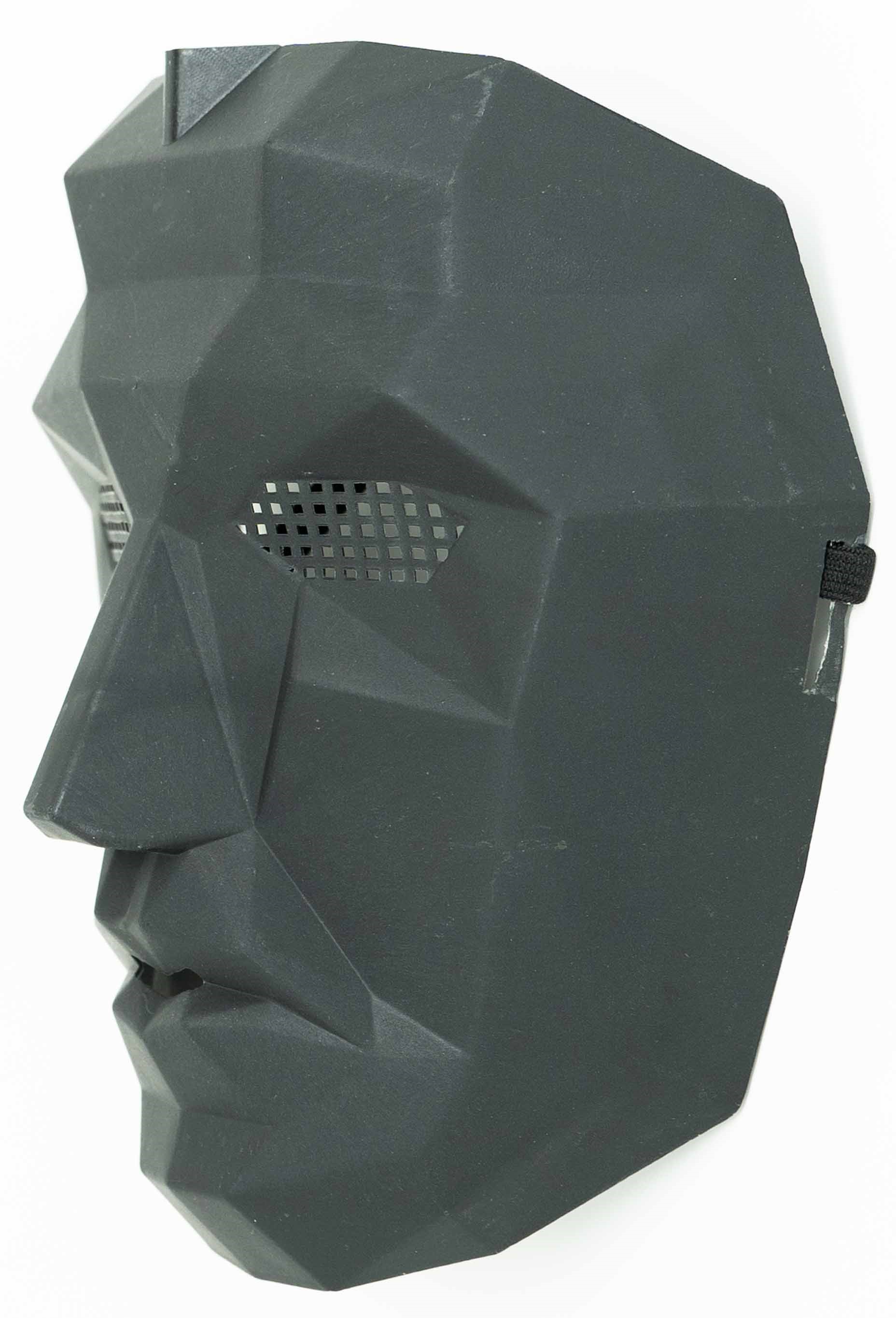 The mask features a sleek, minimalist design that conceals the wearer's true identity while exuding an aura of authority and control.