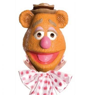 Fozzie Bear Latex Mask - "Wocca Wocca" this is an excellent fancy dress mask exactly like the Fozzie Bear character. Join The Muppets crew and be as funny as the jokes Fozzie tells with this excellent piece. the mask is completed with satin like pink and white neck bow. The mask conveniently has cut out eyes so that you will be easily able to make your way around!
