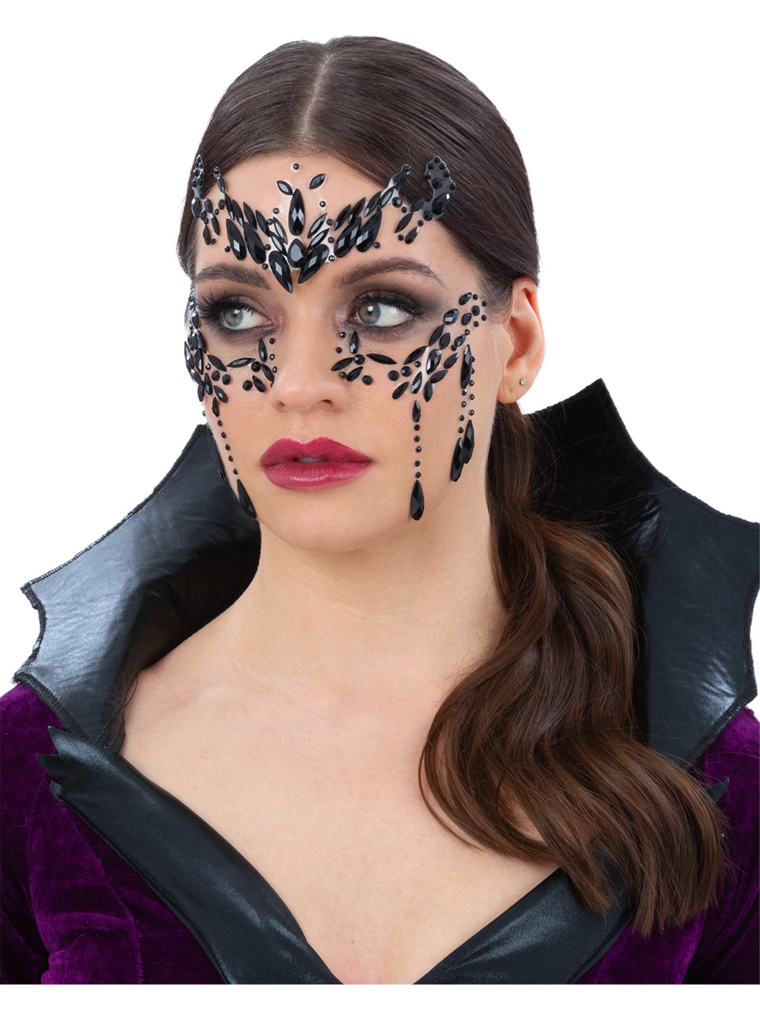 Create a dramatic and elegant look with these Midnight Masquerade Face Jewels. Inspired by classic Venetian mask designs, this self-adhesive jewel set features intricate black gem detailing arranged to frame the forehead, eyes, and cheeks for a striking statement finish.