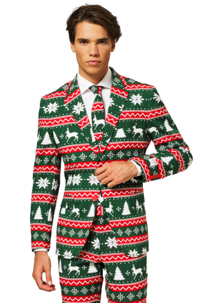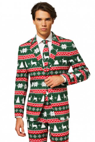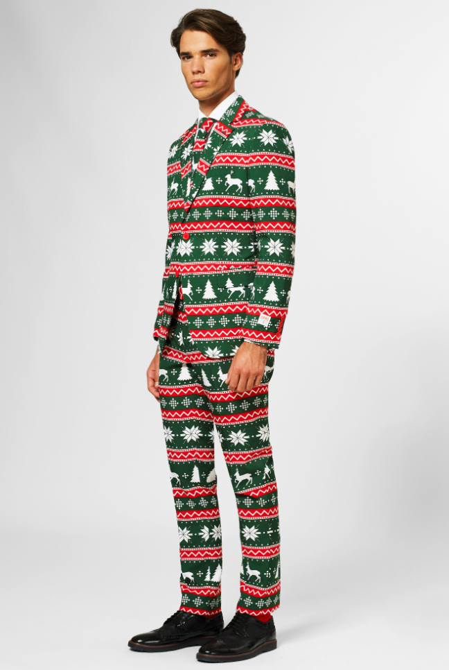 This green Christmas suit with a touch of red is a real must have for the holidays.