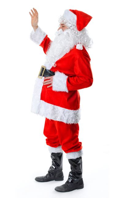 Deluxe Santa Suit includes a jacket, trousers, hat, belt, boot tops beard and moustache.