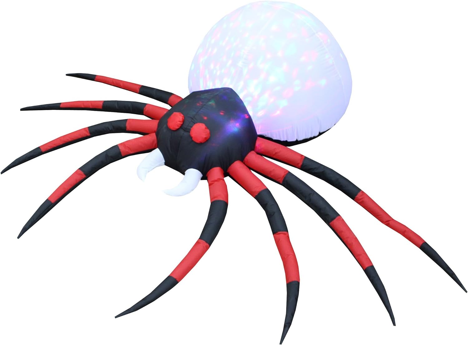 Comes with Tethers and Stakes to mount it outdoors and a blower & Power adapter to inflate. The Spider doubles up as a creepy disco ball with amazing LED Lights that glow in a kaleidoscope pattern.