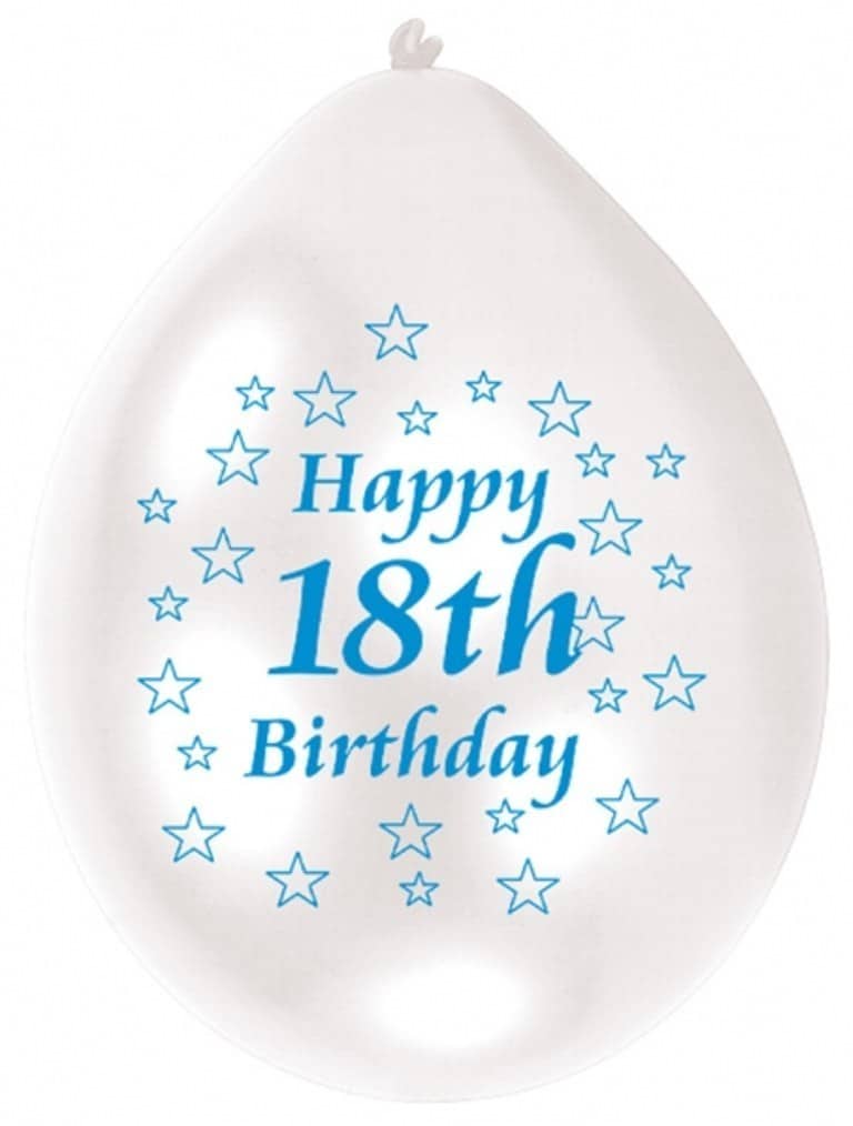 10 Pack of Happy 18th Birthday Balloon. Pack includes 5 white and 5 blue. Balloons measure 9"/22.8cm.