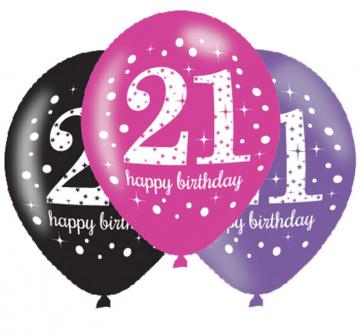 Add the ultimate finishing touch to your birthday party with these amazing black, pink and purple "21 Happy Birthday" balloons.