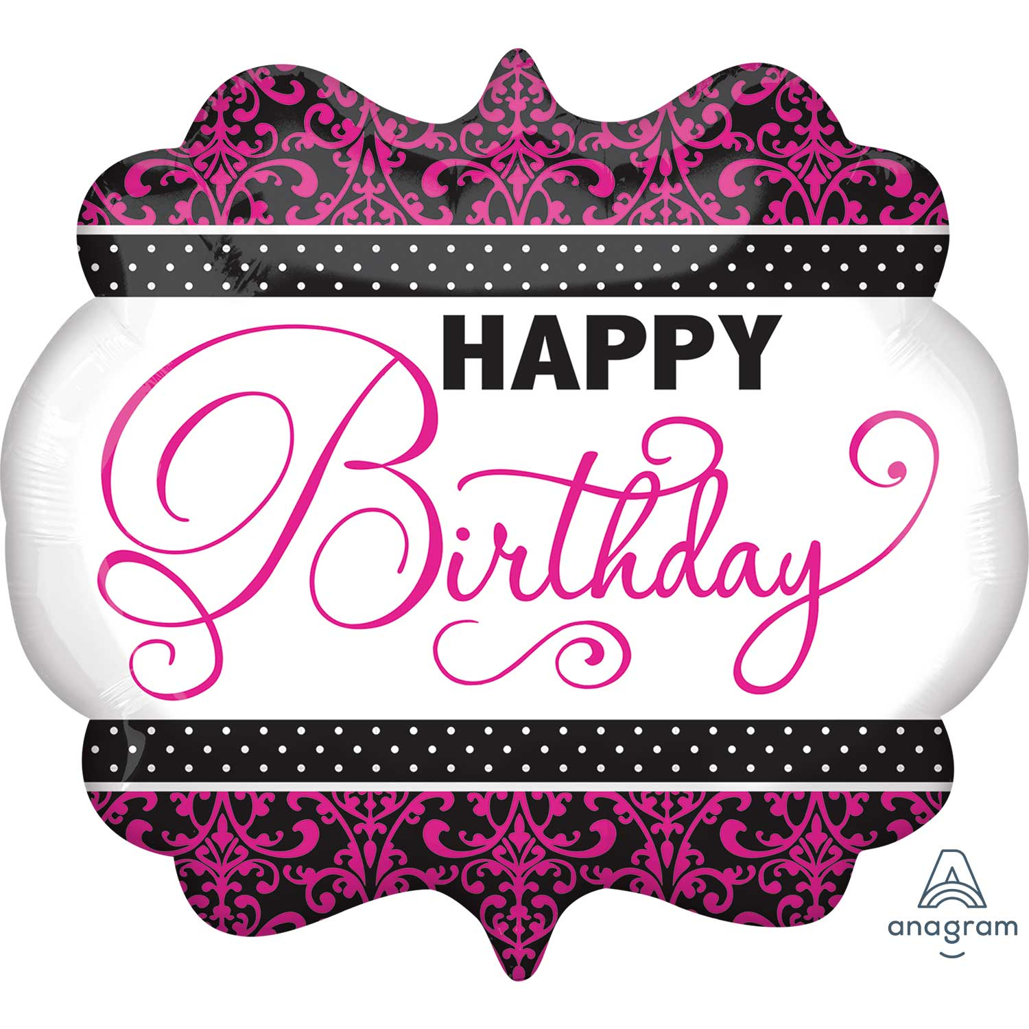 Black, Pink & White Birthday Super Shape Foil Balloons arrives inflated with ribbon and balloon weight.