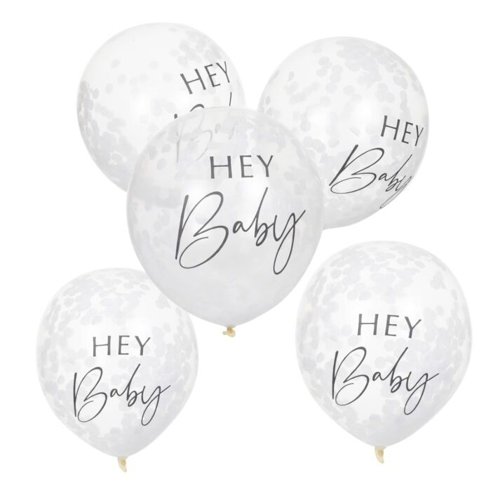 Keep your baby shower decorations simple with these minimalistic Hey Baby shower confetti balloons. These white confetti balloons work well with any theme and are fab for a gender neutral baby shower!