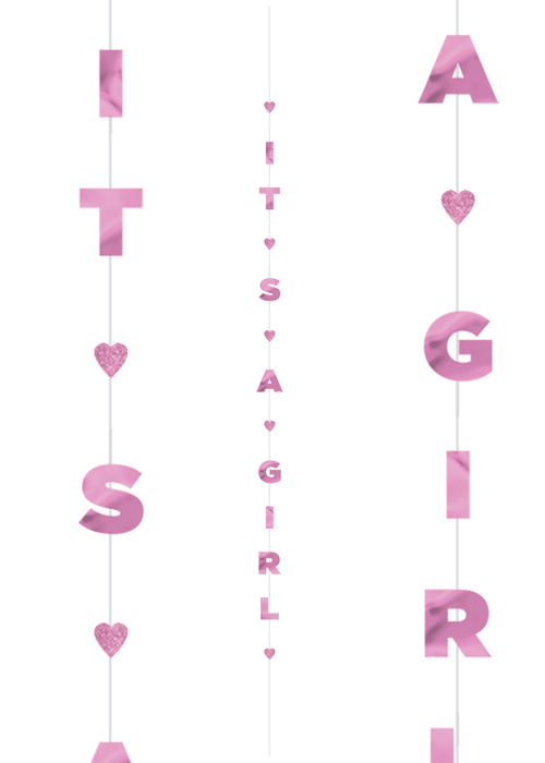 Cute fun girly party decoration for the arrival of a new baby girl metallic pale pink its a girl design balloon tail string, measures 1.82 metres.