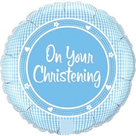On your christening foil balloon is a blue and white gingham print round balloon with a width of 18"/46cm
